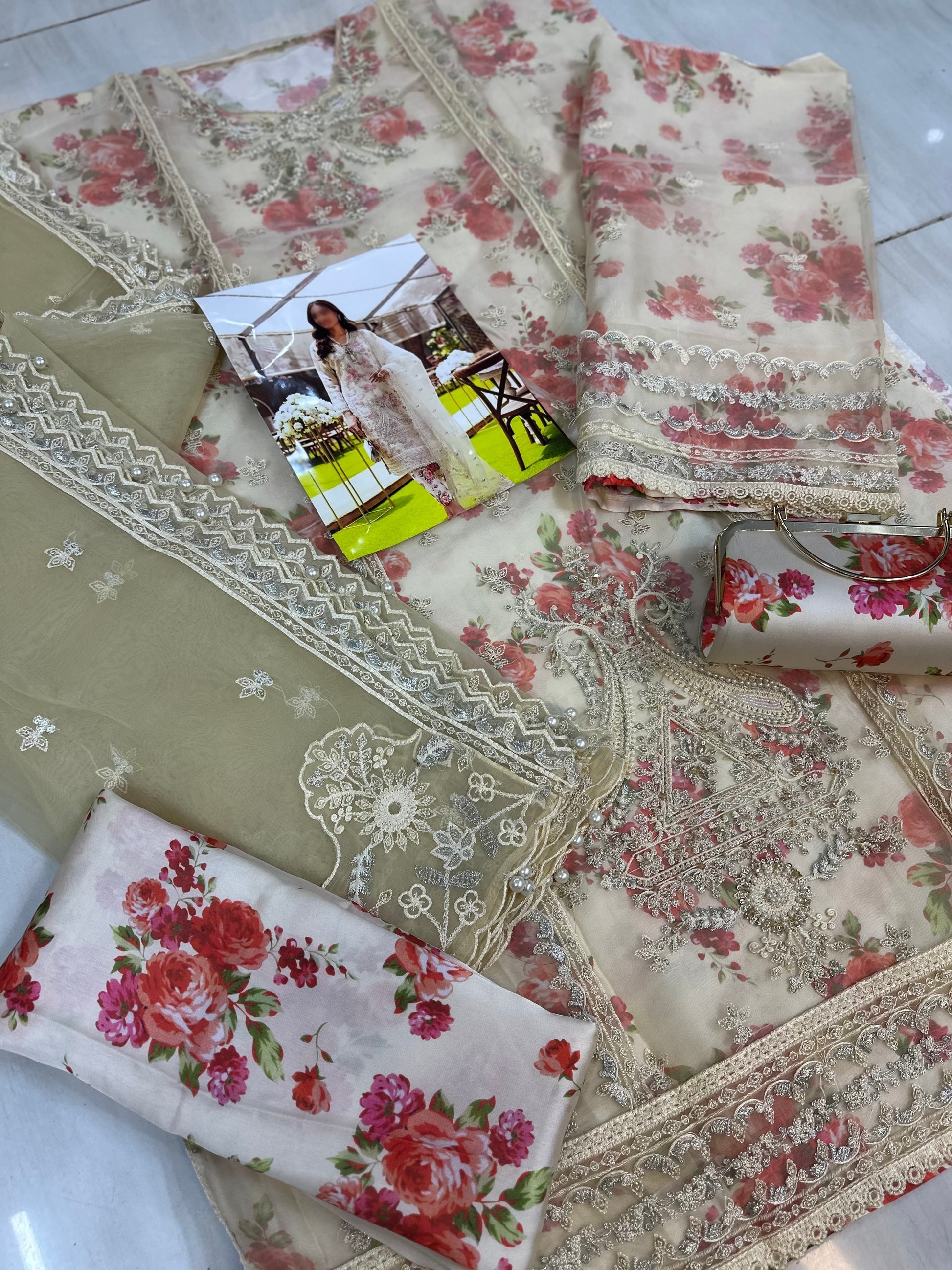 Crafted from premium organza fabric, the shirt features delicate thread, tilla, and sequin embroidery enhanced with fine adda work. It comes with a shamoz silk inner and is semi-stitched for a refined finish. The back side is embroidered, complete with a detailed embroidered border, adding elegance from every angle.