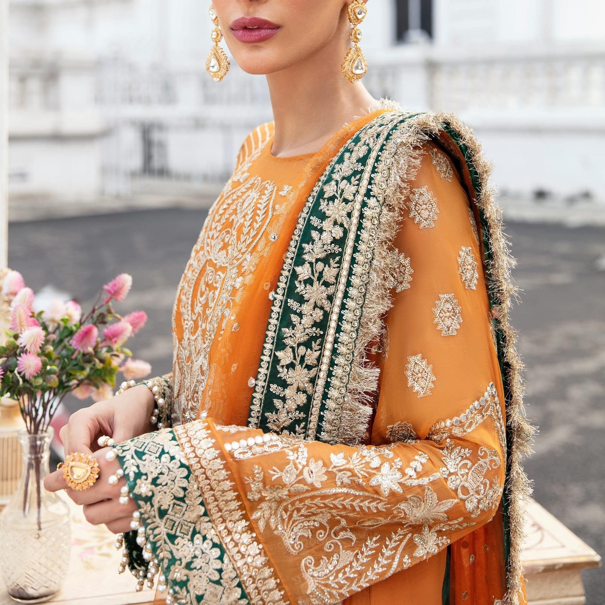 An exquisite partywear outfit with premium fabrics and intricate embroidery: