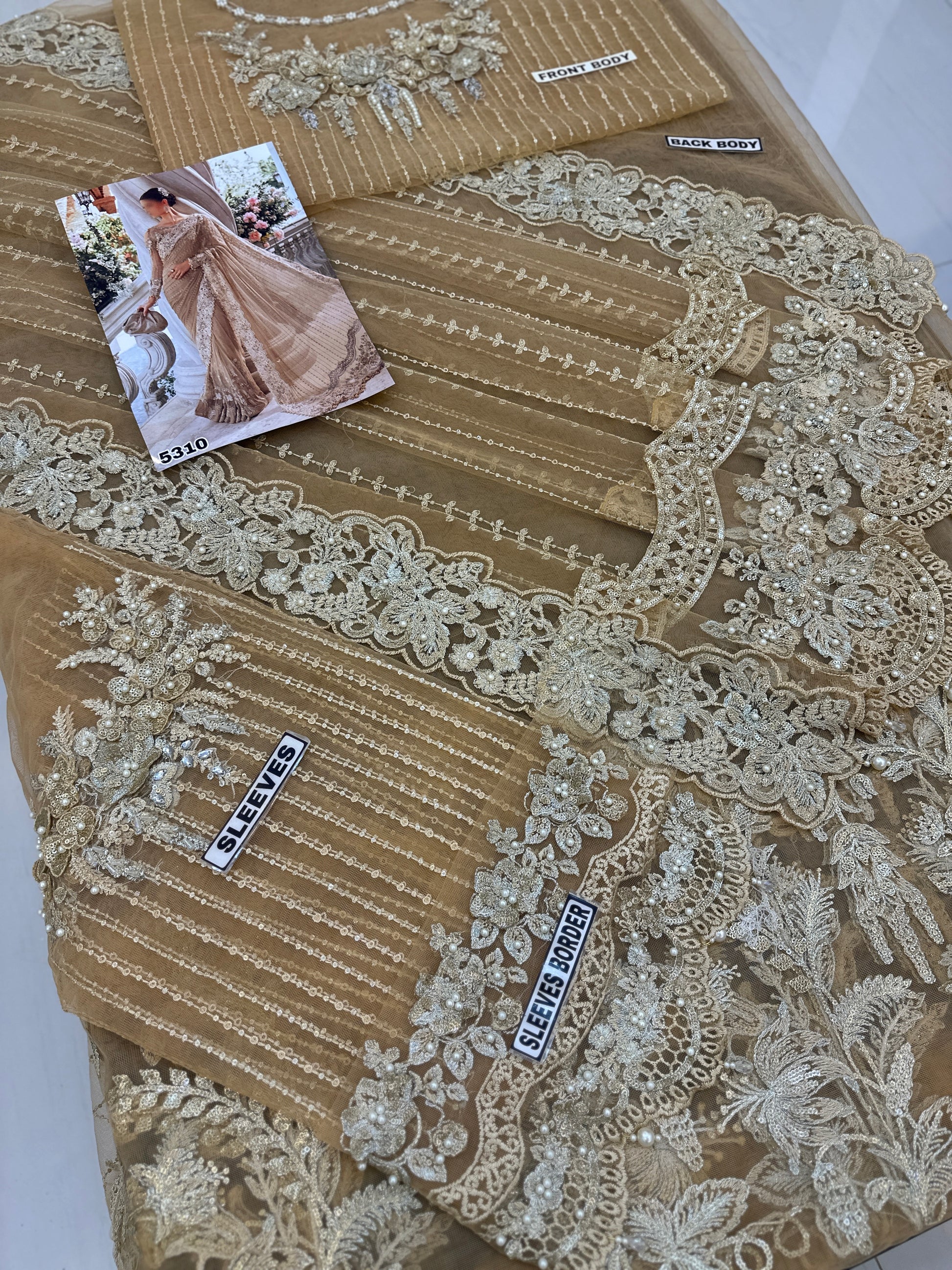• Saree: Full heavy embroidery with stone handwork, finished with elegant pallu & tassels