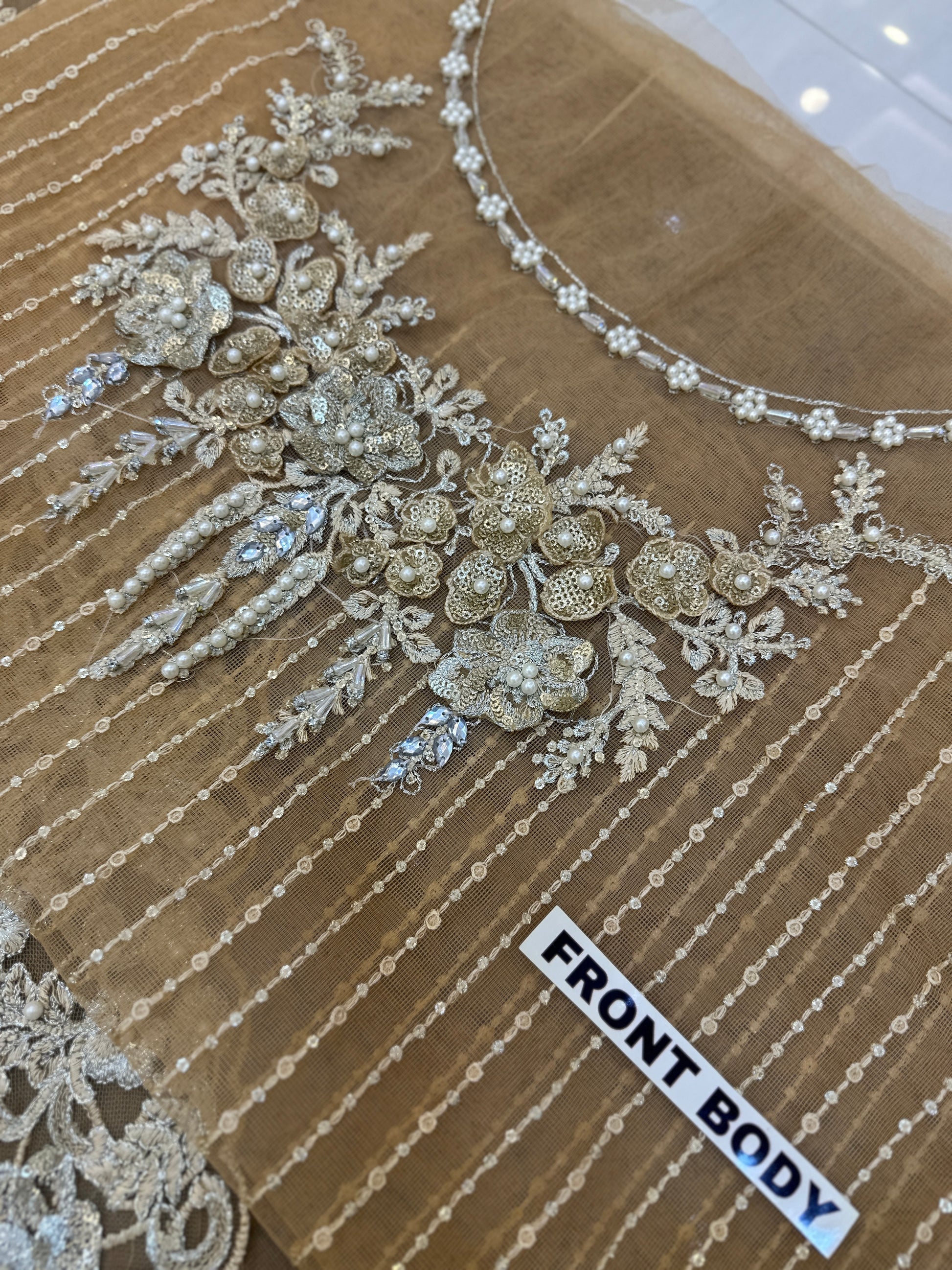 • Blouse & Sleeves: Net fabric with intricate adda work and pearl detailing