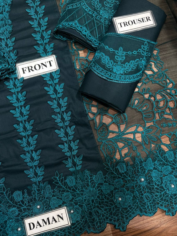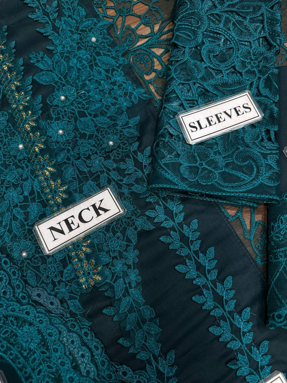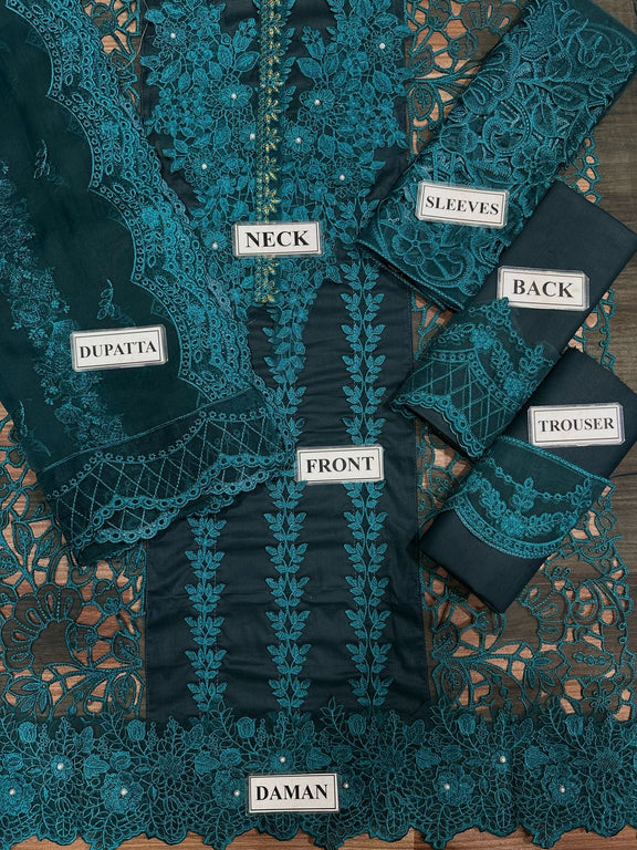 “A luxurious embroidered ensemble featuring a heavily detailed center panel with organza cutwork side panels. Organza sleeves with cutwork accents add elegance, while the plain back is complemented by an embroidered organza border. The ready-to-wear organza dupatta boasts heavy embroidery with front borders and pallu details. Paired with a simple trouser for a complete refined look.”
